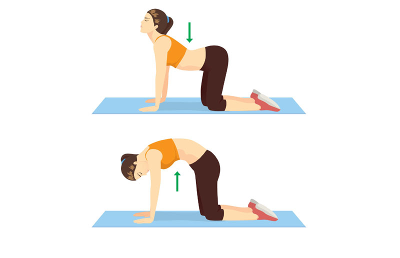 Cat-Cow PoseGet on all fours, placing your palms underneath your shoulders and your knees underneath your hips. First, inhale, as you let your stomach drop down toward the floor. Then, exhale, as you draw your navel toward your spine, arching your spine like a cat stretching.