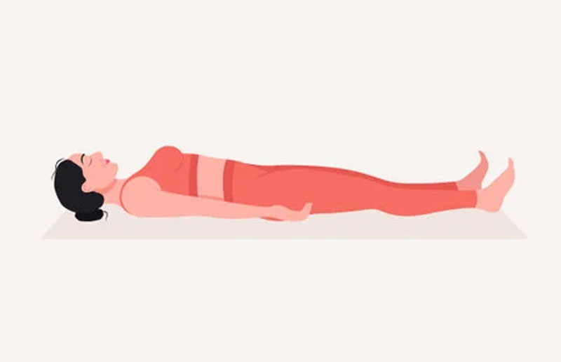 Corpse Pose (Savasana)Lie down with your limbs gently stretched out, away from the body, with your palms facing up. Try to clear your mind while breathing deeply. You can hold this pose for 5 to 15 minutes.