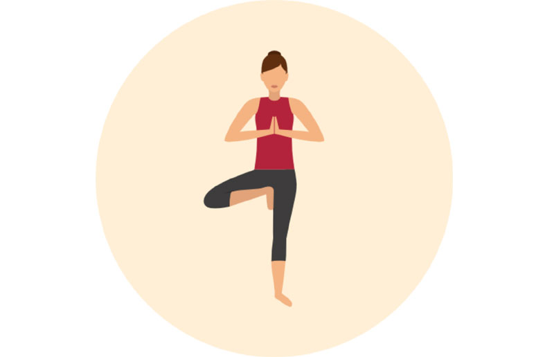 Tree PoseBalance on one foot, while holding the other foot to your calf or above the knee (but never on the knee) at a right angle. Try to focus on one spot in front of you, while you balance for one minute.